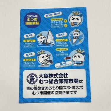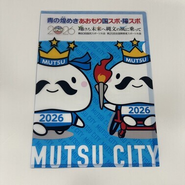 提供いただいたクリアファイルは、表面に国スポ・障スポ仕様の大きなムチュラン、後面にむつ市で開催される競技のムチュランが描かれており、どちらを見てもデザインが魅力的です。