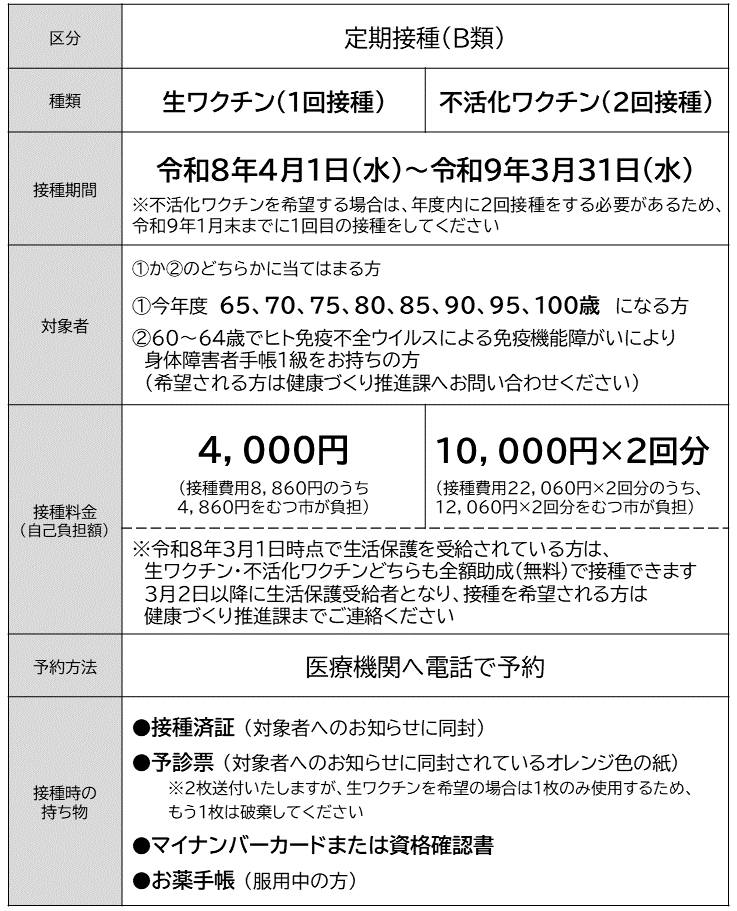 - 不活化ワクチンは公費で2回接種するには、遅くとも令和9年1月末までに1回目の接種が必要のため計画的に接種してください。