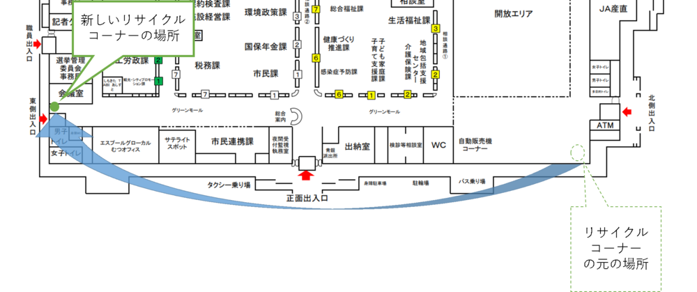 ATM付近を回収場所としていましたが、工事のため東側出入口に移動しました。