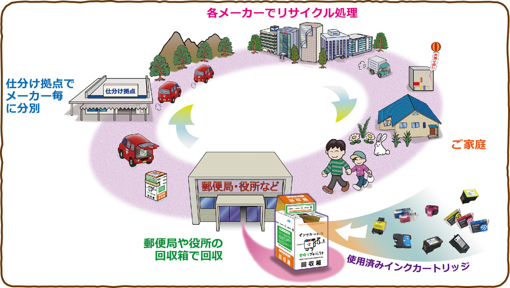 インクジェットプリンタメーカー5社(ブラザー、キャノン、エプソン、日本HP)では、「インクカートリッジ里帰りプロジェクト」と称し、ご家庭で使用したインクカートリッジの回収活動を行っております。所定の場所に設置された回収箱で回収されたインクカートリッジは、各メーカーへ送られリサイクルされるもので、日本郵政グループと共同で行っている取組みです。