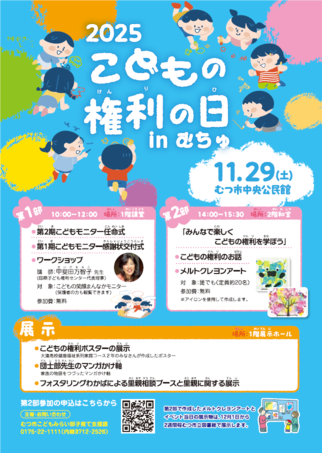 むつ市では、「むつ市こどもの笑顔まんなか条例」で11月20日を「むつ市こどもの権利の日」と定め、令和7年度は11月29日土曜日に、むつ市中央公民館でこどもの権利の日イベントを開催します。