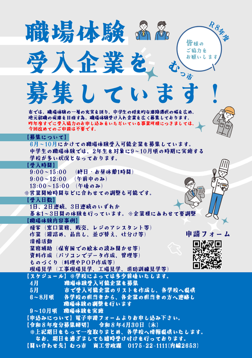 6月~10月にかけての職場体験受入可能企業を募集しています。